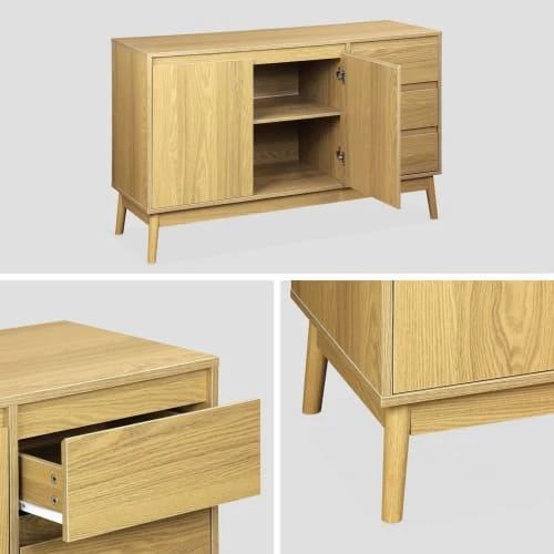A la recherche d’un espace de rangement pratique et esthétique ? Craquez pour le joli buffet de la gamme Dune. Avec lui, le charme scandinave s’invitera dans votre intérieur. Sa structure en décor bois ainsi que son piétement compas lui offre un design sobre et élégant qui sera du plus bel effet chez-vous. Plus besoin de chercher où ranger votre vaisselle ainsi que votre linge de table. Grâce aux 3 tiroirs, 2 portes et 2 niveaux de rangement de ce meuble, vous pouvez tout organiser facilement. N’hésitez pas à ajouter votre touche perso sur son plateau en y déposant vos objets favoris : cadres photo, bougeoirs, plantes…