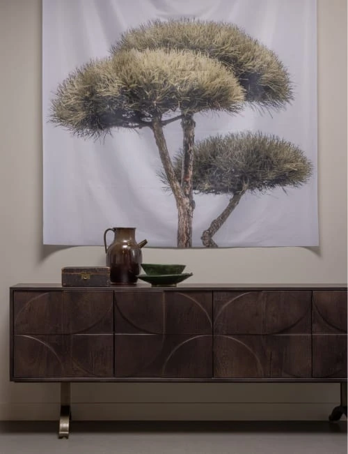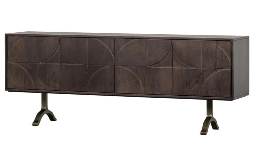 – Buffet ou meuble TV de caractère – Incluant deux trous pour câbles à l’arrière – Fabriqué en bois de manguier avec une finition en noyer – H 70 cm x L 180 cm x P 40 cm Ce buffet caractéristique est issu de la collection de la marque néerlandaise BePureHome. La chaude finition noyer du bois de manguier confère au buffet Duck un aspect attrayant. Le piètement ludique donne de l’air au design et assure une grande stabilité. Les motifs 3D sur les portes confèrent à l’article une atmosphère unique. Matériaux Le bois de manguier est connu pour sa couleur chaude et dorée, sa croissance durable et sa longue durée de vie. Le bois de manguier se caractérise également par des veines et des nuances de couleurs bien visibles. Les grains, une lueur jaune ou des lignes et des nœuds sombres rendent chaque article en bois de manguier unique. Le bois de manguier est très solide et fait partie des bois les plus durs. Un article en bois de manguier ne s’abîme donc pas facilement. Dimensions – Hauteur : 70 cm – Largeur : 180 cm – Profondeur : 40 cm – Cadre : 1,5 cm – Hauteur du sommet : 43 cm – 4xPorte : H40 cm x W44 cm avec fermeture magnétique – 2×2 compartiments : H19,5 cm x L87 cm x P34 cm y compris 2 trous pour câbles – Hauteur des pieds : 27 cm – Largeur de la jambe : 4 cm – Profondeur des jambes : 35 cm – Espace à côté des jambes : 21 cm – Espace entre les jambes : 130 cm – Charge maximale sur le dessus : 35 kg – Poids maximal par étagère : 15 kg Maintenance Les meubles en bois de manguier sont faciles à entretenir. Il suffit de les dépoussiérer et de les nettoyer à l’aide d’un chiffon propre et légèrement humide. Les articles en bois de manguier sont uniquement destinés à un usage intérieur.