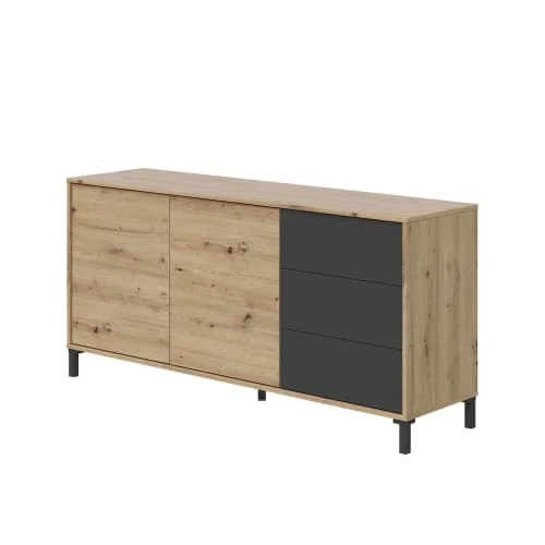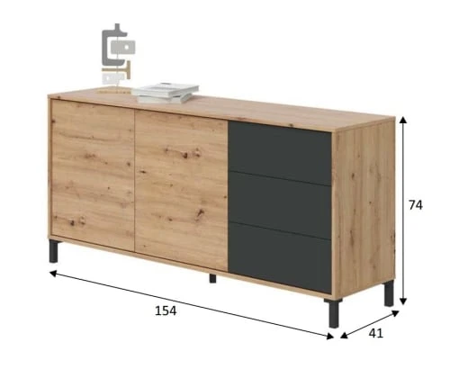 BUFFET – Buffet design pouvant servir de meuble TV de salon, composé de deux portes et deux tiroirs, effet noué chêne et coloris anthracite. STRUCTURE ET UTILISATION – La structure se compose de deux portes et de deux tiroirs avec ouverture pratique et innovante avec système Push, à l’intérieur des portes il y a deux étagères pratiques, meuble idéal pour ranger tout ce que vous voulez de manière discrète et bien rangée, il est construit dans un façon fonctionnelle afin de l’adapter à n’importe quel espace, même les plus petits. COMPOSITION – Entièrement construit en panneaux de particules mélaminés, un matériau résistant à l’abrasion, aux chocs et aux rayures. CARACTÉRISTIQUES TECHNIQUES : Dimensions en cm – 154 x 41 x 74 cm – Capacité des tiroirs – 10 x 45 x 30 cm – Matériaux – Pièces en aggloméré mélaminé (classement TYPE E1 épaisseur 15 mm) – Chants – épaisseur 0,6 mm – Tiroirs – Épaisseur – côtés 12 mm et fond 3mm coloris blanc – Dossier – épaisseur 3mm – Poids maximum supporté armoire 40 Kg – Poids maximum supporté par tiroir 5 kg – Poids maximum supporté par étagère 8 Kg. COMPOSANTS – Charnière métallique pour les portes – Goujons en ABS anti-bruit et anti-rayures pour la partie inférieure du meuble, de couleur noire et de 10,5 cm de hauteur – Système d’ouverture de type “PUSH” pour les portes et les tiroirs – Guides métalliques coulissants pour les tiroirs (NON amovibles) – Étagères non réglables en hauteur