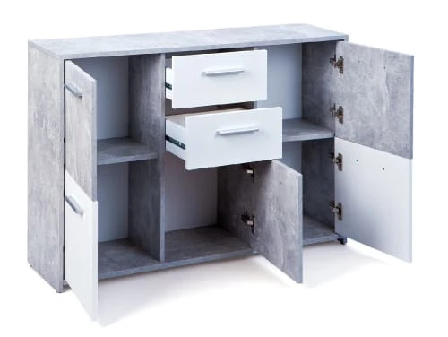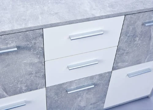 Buffet en bois mélaminé laqué, un matériau qui garantit résistance et facilité de nettoyage. L’effet damier né du contraste de ses couleurs blanc et béton fait de ce buffet un élément d’élégance fondamentale pour votre mobilier. Précisément les couleurs et leurs compositions linéaires avec portes et tiroirs vous permettent de placer ces buffets non seulement dans la cuisine, mais aussi dans la chambre, la salle de bain ou le salon. Équipé de guides métalliques robustes qui augmentent sa praticité et sa résistance. La polyvalence de ces articles vous permet de l’utiliser dans n’importe quel environnement, du salon à la salle de bain ou dans les chambres d’hôtel. Mesure 115 x 77 x 30 cm.