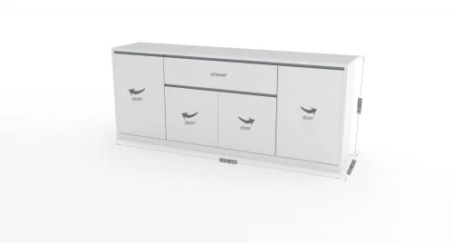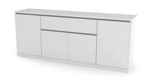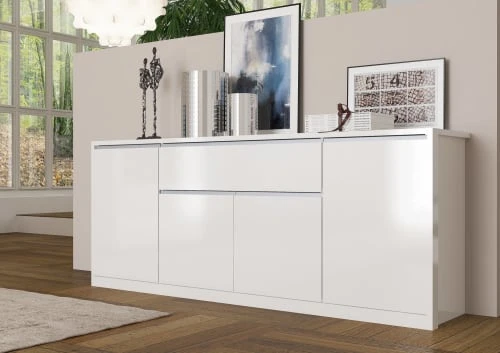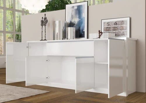 BUFFET MODERNE: Buffet design pouvant servir de meuble TV de salon, buffet moderne avec quatre portes et un tiroir dans la partie centrale – Entièrement de couleur blanc brillant. STRUCTURE ET UTILISATION: Buffet de salon pratique et peu encombrant structuré avec quatre portes battantes de différentes tailles, des compartiments internes et un tiroir dans la partie centrale – Les portes et les tiroirs sont sans poignées tous deux équipés de fortes charnières/guides métalliques – La structure est entièrement de couleur blanc brillant – L’étagère supérieure est parfaite pour ranger votre téléviseur ou vos bibelots préférés. PRATIQUE ET INNOVANT: Son design moderne et élégant rend ce buffet avec portes et tiroirs parfait pour être placé dans un environnement moderne et lumineux, dans n’importe quelle pièce de votre appartement, du hall à la chambre: c’est le produit idéal pour ceux qui recherchent un élément fonctionnel et peu encombrant pour leur maison – La couleur blanche brillante est innovante et en même temps s’adapte facilement à tout type d’environnement. 100% MADE IN ITALY: La production 100% italienne garantit fiabilité, résistance, confort et durabilité dans le temps l’attention aux processus de production, le choix de matières premières de qualité et le souci du détail font de ce produit de fabrication noble. CARACTÉRISTIQUES TECHNIQUES: Entièrement en stratifié, il résiste aux chocs et aux rayures, et est durable dans le temps – Nettoyage rapide et facile grâce au matériau qui le compose – Fourni démonté avec kit et livret d’instructions de montage – Un soin et une attention particuliers à l’emballage, résistant et adapté au transport – Dimensions en cm: 210x45h85.
