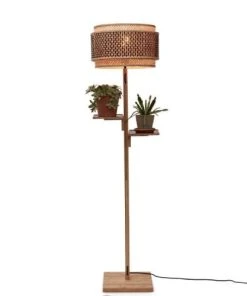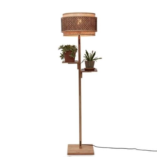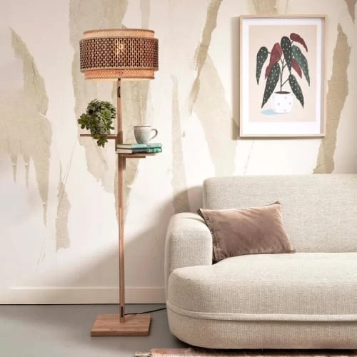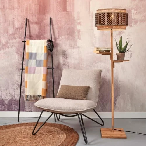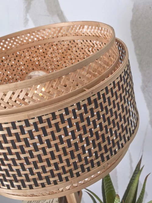 La nouvelle collection Good&Mojo de luminaires Bhutan regroupe des plafonniers, des suspensions mais aussi des lampadaires et des appliques, de quoi réaménager tout votre intérieur. Bhutan s’inspire, comme son nom l’indique, de l’unique pays du monde au bilan carbone négatif qui porte le même nom. Le lampadaire avec étagères Bhutan se compose ainsi de deux structures emboîtées, rondes et en bambou et de deux petits socles faisant office d’étagères. Ces structures tressées à la main sont ajourées et permettent ainsi de laisser passer la lumière. Un agréable et doux jeu de lumières se diffusera dans toute votre pièce. Son aspect naturel et simple apportera également de l’élégance à votre intérieur.