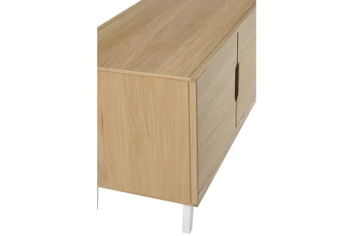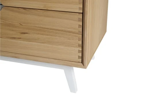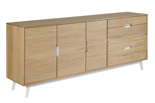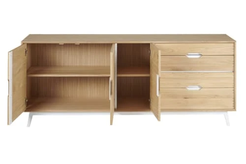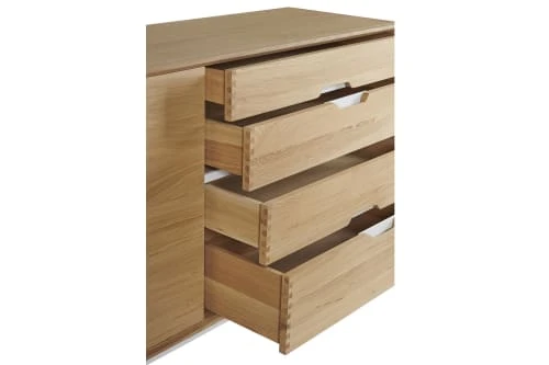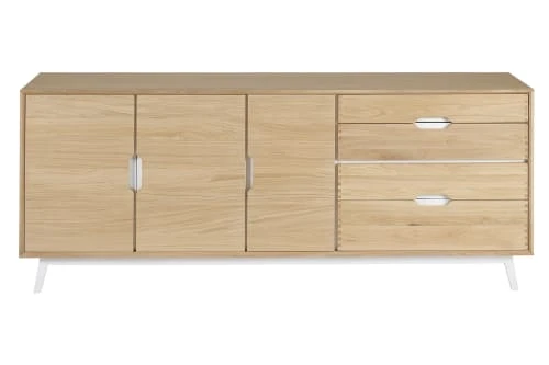Le “Grand” buffet bas JOYCE aux influences Scandinaves offre la plus grande capacité de rangement de la collection. Fabriqué en bois massif et placage de chêne , il se décline en deux versions: finition chêne avec détails en blanc ou finition chêne avec détails en noir. Ces deux déclinaisons ont été conçues pour s’adapter aux ambiances de votre salle à manger. Les détails en blanc pour une déco chaleureuse et cosy, et les détails en noir pour un style plus moderne ou industriel. Un bahut bas avec de nombreux rangementsCe magnifique buffet contemporain de 200 cm longueur s’agence en trois portes et quatre tiroirs asymétriques aux dimensions déstructurées. Ces rangements offrent un bon volume de rangement conçu pour accueillir votre vaisselle, couverts ou linge de table. Avec un piétement en bois massif, ce meuble se positionne à 15 cm du sol.Les quatre tiroirs aux dimensions différentes s’ouvrent par des passes doigts et se referment en douceur avec leur système de fermeture progressive. Les façades de tiroir présentent un assemblage en queue d’aronde rappelant les techniques d’ébénisterie utilisées dans la fabrication des meubles de qualité.Au centre, une porte ouvre un espace aménagé d’une tablette réglable qui pourra accueillir vos verres ou bouteilles.La partie gauche est agencée par deux portes de dimensions différentes à fermeture progressive. A l’intérieur, le volume de rangement est compartimenté par une tablette en bois de 20 mm d’épaisseur et réglable en hauteur.Collection Joyce : des meubles scandinaves en bois massifConçu et dessiné par le bureau d’étude HELLIN, cette collection exclusive s’adresse aux amoureux du design et de la décoration. Pensés dans leurs moindres détails, les meubles Joyce se d…
