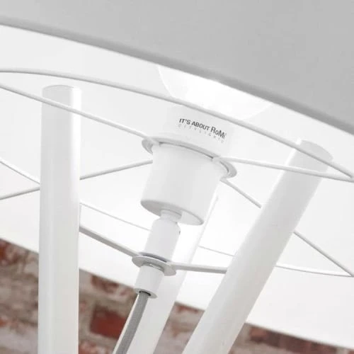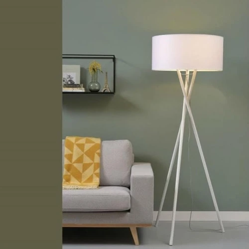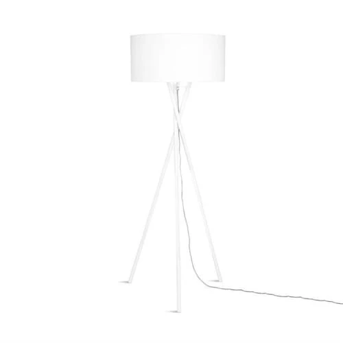 Ce lampadaire moderne est composé d’un pied tripode en tubes métalliques et d’un abat-jour cylindrique habillé de toile de coton, l’ensemble est équipé d’un cordon d’alimentation avec prise de secteur et interrupteur.