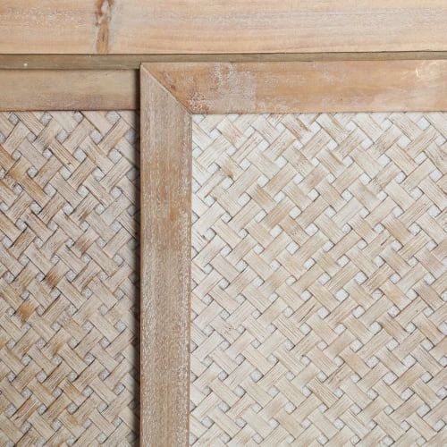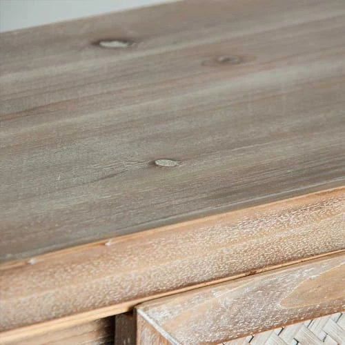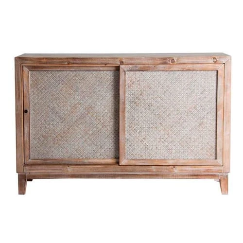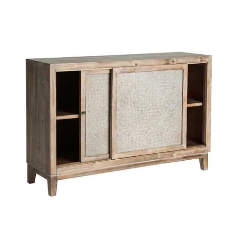 Aparador con puertas correderas y un estante interior, fabricado en madera de abeto combinado con madera DM y madera contrachapada, con un acabado blanco decapado.