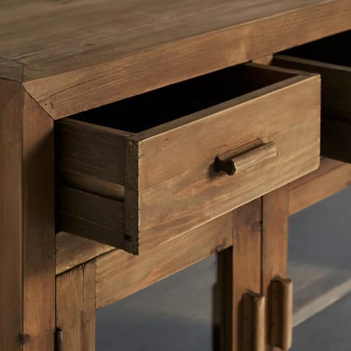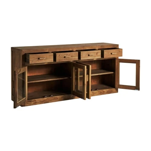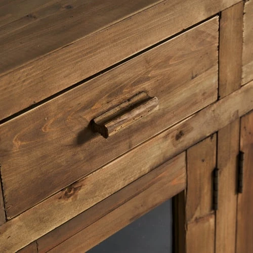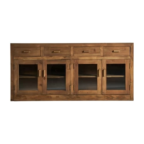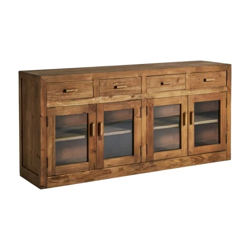 Avec une structure solide et accueillante en bois de pin, le buffet Mens va venir agrémenter vos pièces les plus chaleureuses. Il est entièrement fabriqué en bois de pin incolore et il est constitué de quatre tiroirs en haut et de quatre portes qui s’ouvrent sur des étagères intérieures en haut. C’est un meuble qui s’accordera parfaitement avec d’autres meubles de style nordique et colonial dans le salon. Sa taille est de 160x42x76 cm.