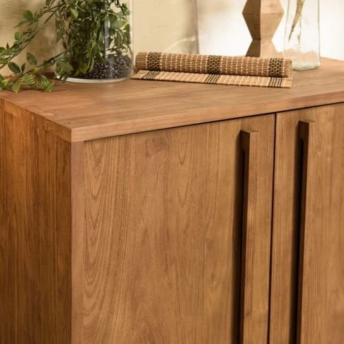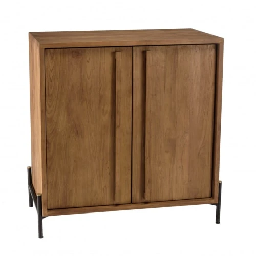 Buffet 2 portes en bois de teck recyclé pieds en métal noir. Dimensions : 84 x 42.5 x 85.5 cm. Article en Teck recyclé/Acier. Imaginez ce buffet minimaliste chez vous ! Doté de 2 étagères, vous pourrez y ranger vos objets du quotidien. Ses jolies matières trouveront parfaitement leur place dans votre intérieur.