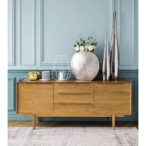 - Côté rangement, ce buffet style vintage possède 3 tiroirs centraux et 2 portes avec une étagère ajustable dans chacune.