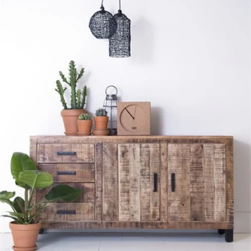 matière : Matériaux : Bois (manguier) + métal Pieds : Métal Type de bois : Manguier Nombre de tiroirs : 4 Nombre de portes : 2 Nombre d’étagères : xxx