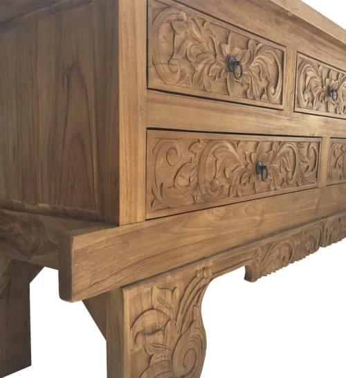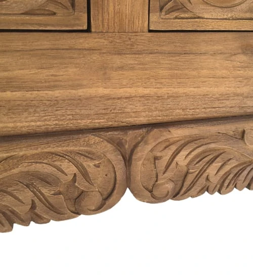 Buffet UKIR , fabriquĂ© Ă la main en bois de teck avec dĂ©tails sculptĂ©s. Un produit unique et fonctionnel avec ses 5 tiroirs. Avec un style colonial, c’est le choix parfait pour apporter Ă©lĂ©gance et distinction . Aucun assemblage requis.