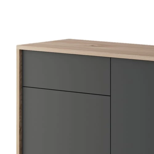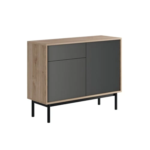 Buffet 2 portes 1 tiroir Matheo Bois et Gris anthracite mat Fabrication Européenne – Collection : Matheo – Couleur : Bois façon chêne – Façades gris anthracite mat – Pieds noirs – Matériaux : Panneaux agglomérés – Pieds en bois peint en noir – Caractéristiques: 2 portes – 1 tiroir – 2 étagères – Portes et tiroir avec ouverture “push to open” – Poids et dimensions : 34 kg – 104 x 39 x 84 cm – Produit livré, à monter, notice incluse – Produit garanti 24 mois