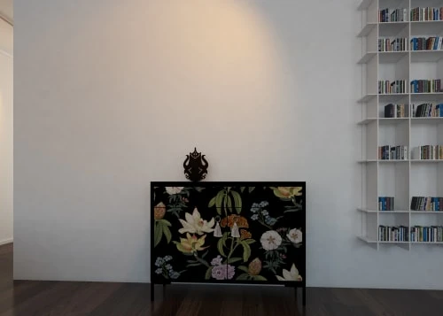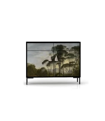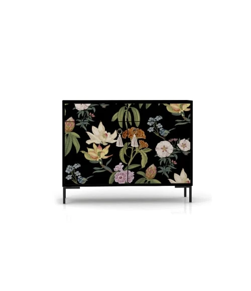 Portes avec imprimés et teintures respectueuses avec l’environnement, charnières avec fermeture amortie gués et poignées métalliques.