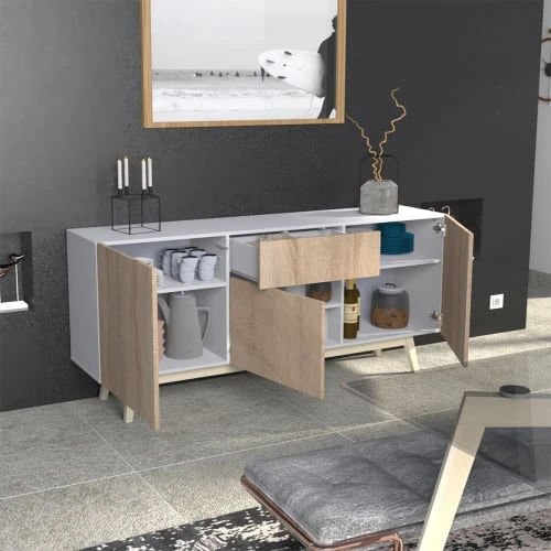 Buffet 3 portes 1 tiroir Weber Industries Home Chêne blanchi et blanc Marque Weber Industries – Matériaux: – Structure en panneau de particules – Portes en panneau de particules – Couleurs / Motifs: – Structure buffet en blanc – Portes en chêne blanchi – Piétement en tilleul – Caractéristiques: – Ouverture des portes sans poignée (Push-pull) – 3 portes, 1 tiroir – 3 espaces de rangements – Piétement en tilleul – Hauteur 20 cm – Poids net : 58,9 kg – Dimensions: 180 x 42 x 80 cm (L x l x H) – Garantie Produit Weber Industries garanti 24 Mois.