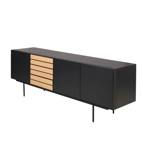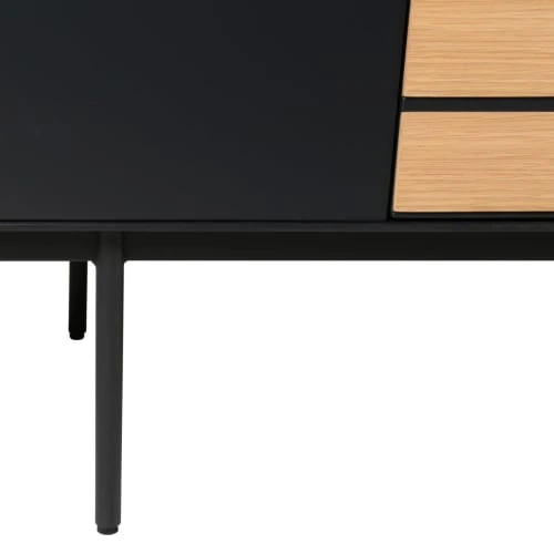 Informations techniquesDimensions : L x P x H : 200 x 50 x 75 cmPoids total du produit : 0 kgInformations additionnellesHauteur pieds : 22cmDimensions étagères : 47 x 46 x 20.5 cmMatière : ChêneDétails matières : Corps : MDF placage chêne, laquéPieds : Metal laqué, texture sabléeConditionnement : Produit expédié en un seul colis.Corps : MDF placage chêne, laquéPieds : Metal laqué, texture sablée